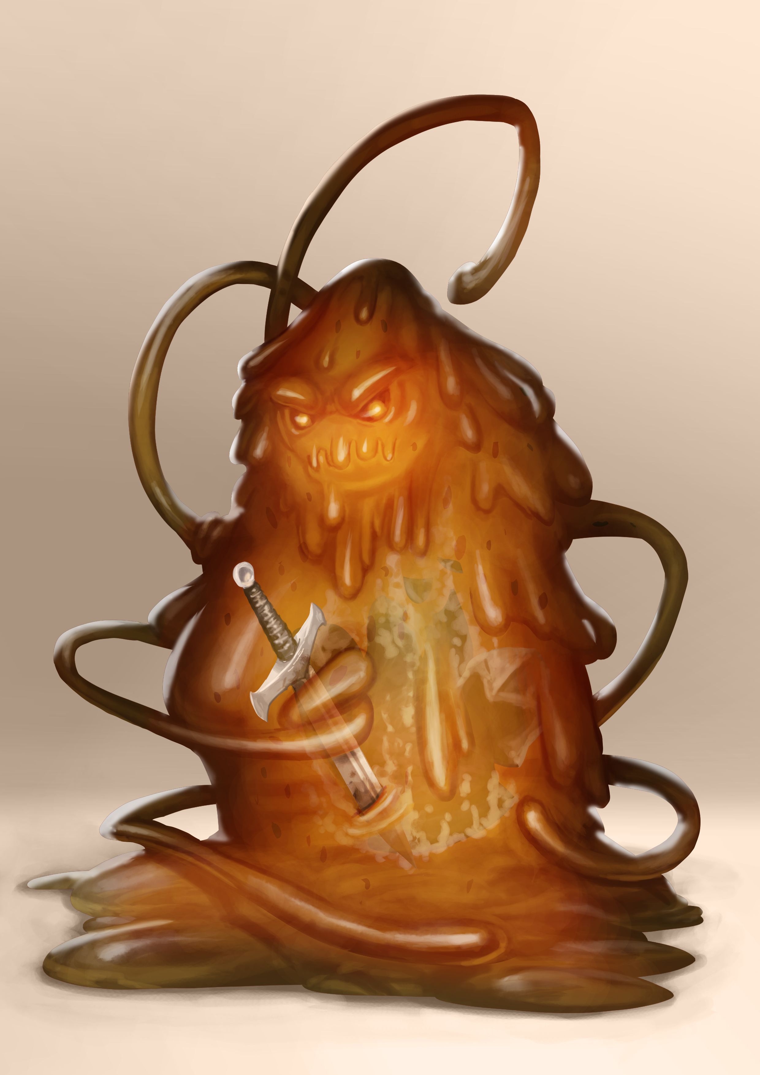 Ratfink is a Rust Slime, which are viscous, sentient oozes. They have a powerful base that is extremely caustic and exactly opposite of an acid. It breaks down metals by oxidizing them and tends to leave flesh alone, however, flesh is not immune to the power of oxidation, nor is a victim’s blood. Being a lithotroph (its diet consists of metals), the Rust Slime consumes weapons and armor. It is not just sentient but prefers to maliciously attack travelers for their gear.